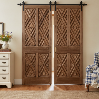 Antique doors from India bring a new narrative into the space. Richly carved and worn smooth by decades of use, these doors function as functional art. Some serve as interior French doors, allowing light to filter through while framing views, while others stand alone as dramatic thresholds. Their intricate floral and geometric motifs add depth and texture, offering a counterpoint to the farmhouse's simpler finishes.
